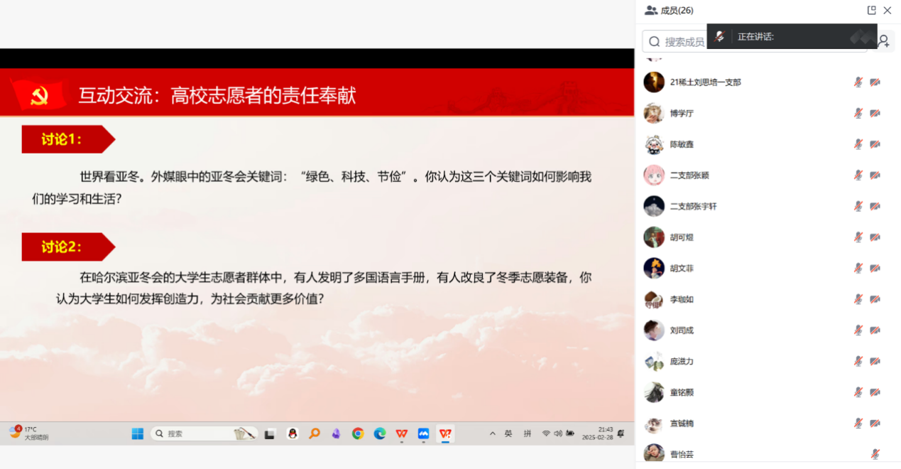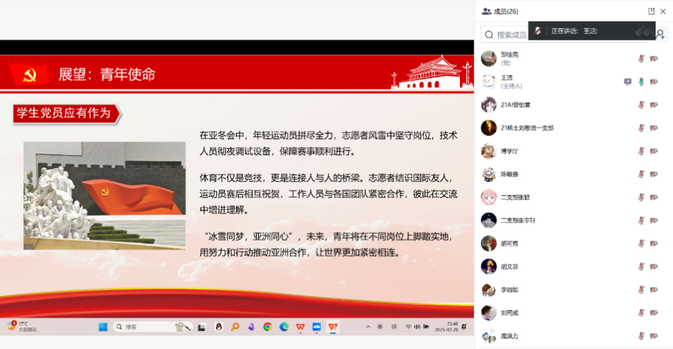 图/全体学生党员参会 主讲人从冰雪纽带、拼搏创新、互动交流、展望未来等四个部分带领我们进行学习,一起感受“冰天雪地”的热土创造“金山银山”的幸福。主讲人首先介绍亚冬会的发展过程与中国贡献,向我们展示中国时代进步与改革创新的成就,并将1996年亚冬会主火炬与2025亚冬会主火炬做比较,以亚冬会彰显中国力量;之后观看《亚冬会这群高校志愿者超给力》视频感受其中高校志愿者的责任与奉献,他们为解决语言沟通问题做足准备,展现了中国大学生的青春风采。 图/内容节选 各位党员同志围绕本次微党课内容进行思考讨论,结合自身情况进行了分享交流。最后,主讲人结合国家主席习近平在致辞中强调的三个关键词“和平、发展、友谊”展望未来,表示在任何时候我们都要以包容共存、交流互鉴的角度思考问题,守正创新,埋头苦干,向优秀共产党员学习,切实做到携手共进、共谋发展!