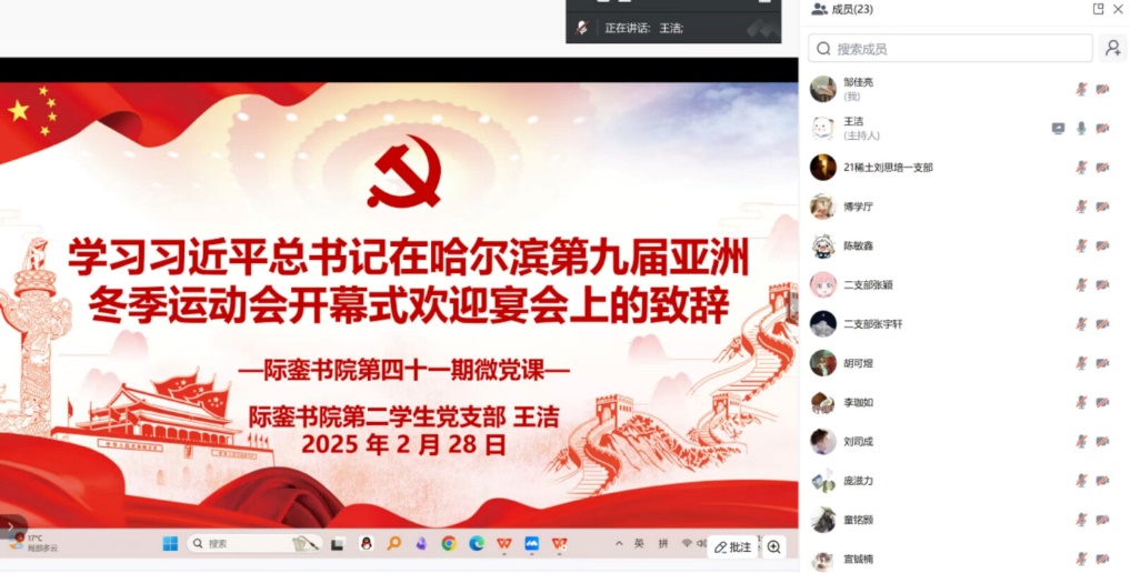哈尔滨第九届亚洲冬季运动会是继北京冬奥会后我国举办的又一重大综合性国际冰雪运动盛会。在开幕式欢迎宴会上的致辞中,国家主席习近平以“承载着亚洲人民对于和平、发展、友谊的共同愿望和追求”来传递本届亚冬会主题“冰雪同梦、亚洲同心”的深远意义。 本期微党课于2025年2月28日通过线上、线上相结合的形式开展,由际銮书院第二学生党支部王洁同志主讲,支部全体党员参加,让我们跟随她一同学习。