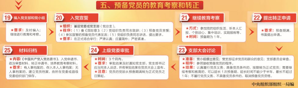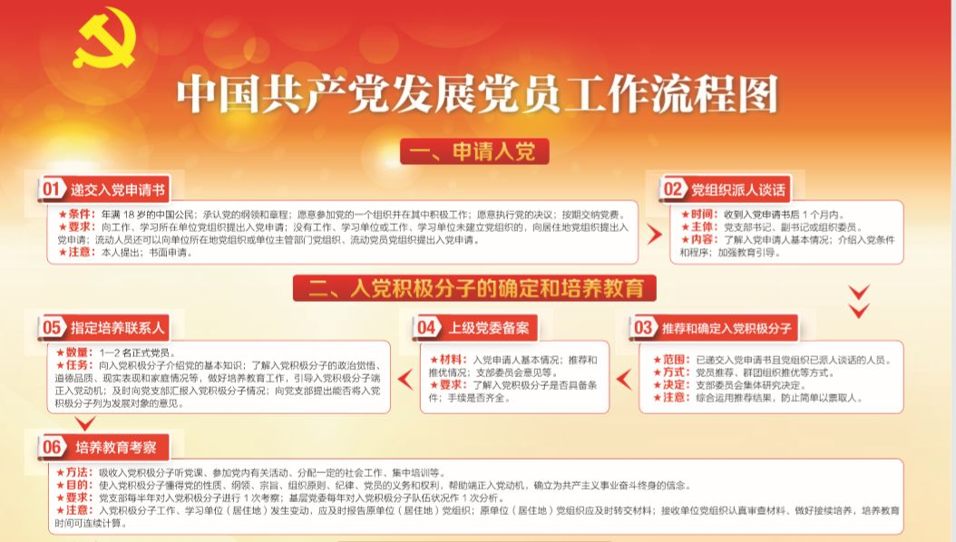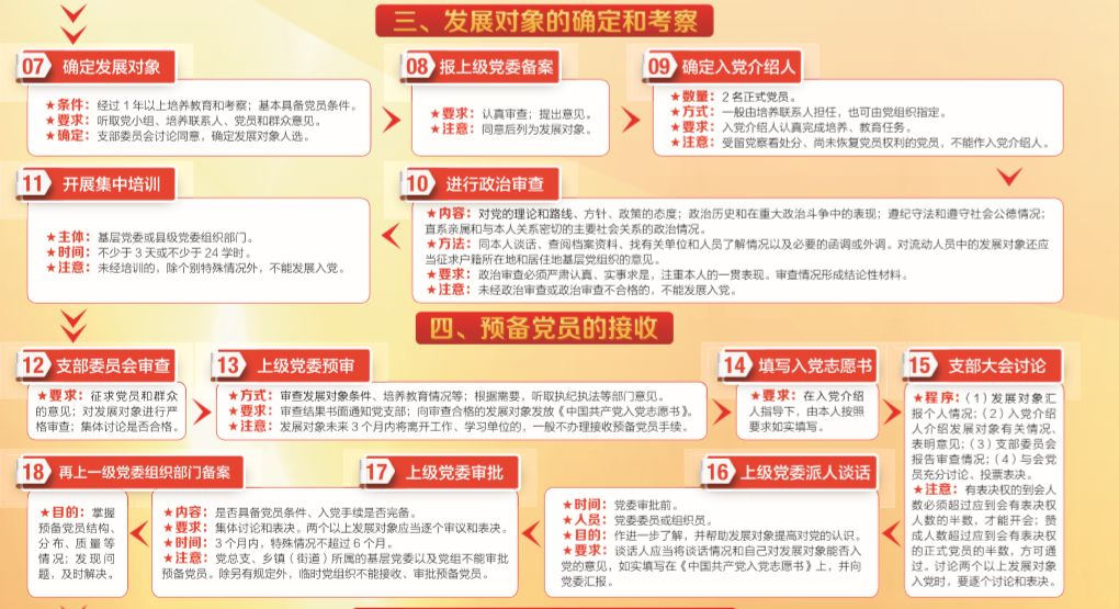 一、党员发展流程 党员的发展流程分为五个不同的阶段,每个阶段我们所要做的事情不同,我们的政治素养也会发生变化。 (一)申请入党阶段 (二)确定入党积极分子阶段 (三)确定和考察发展对象阶段 (四)接收预备党员阶段 (五)预备党员转正阶段