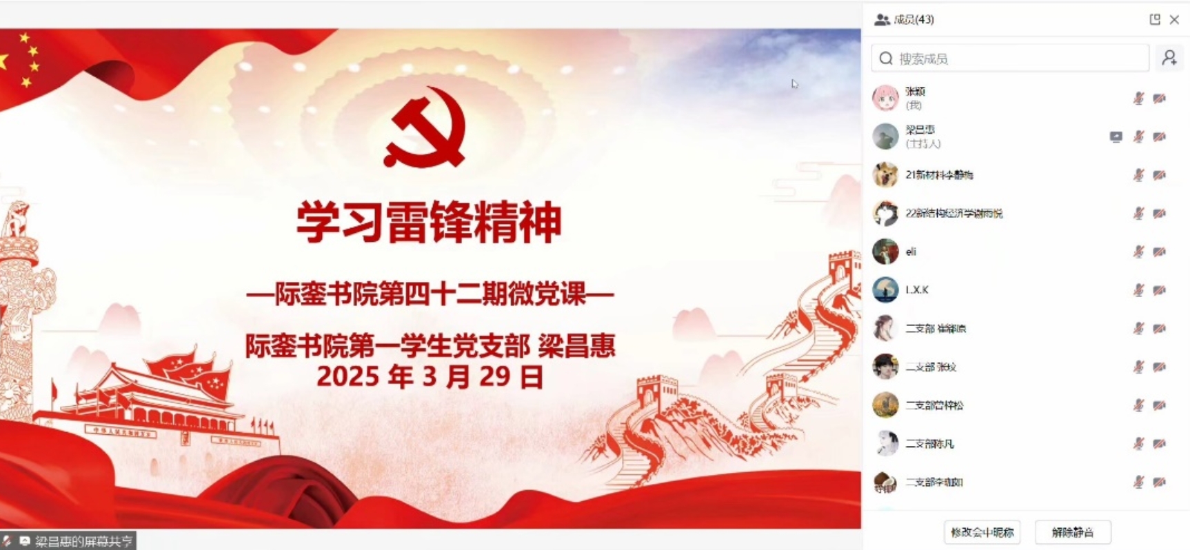 雷锋精神是中国共产党人精神谱系的重要组成部分,滋养着一代代中华儿女的心灵。2025年3月5日是第62个学雷锋纪念日,习近平总书记对深入开展学雷锋活动作出的重要指示强调,要深刻把握雷锋精神的时代内涵,让雷锋精神在新时代绽放更加璀璨的光芒。 本期微党课于2025年3月29日通过线上、线下相结合的形式开展,由际銮书院第一学生党支部梁昌惠同志主讲,支部全体党员参加,让我们跟随他一同学习。