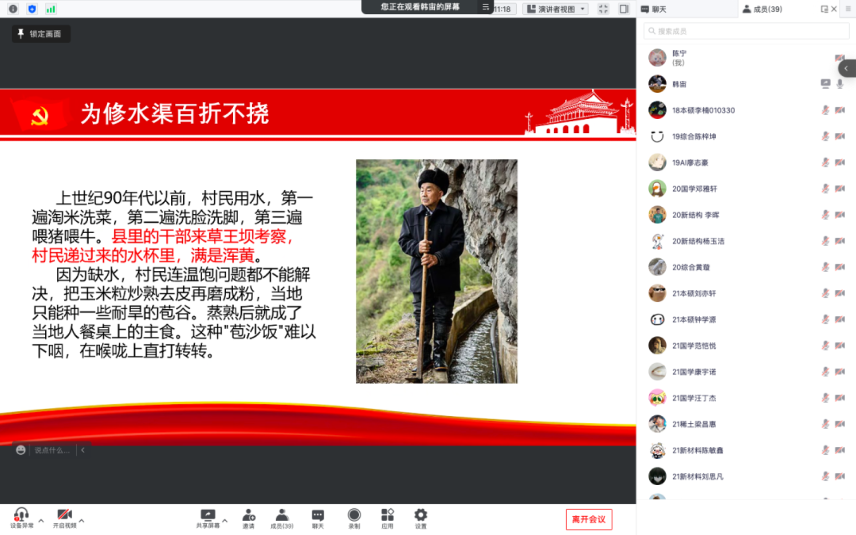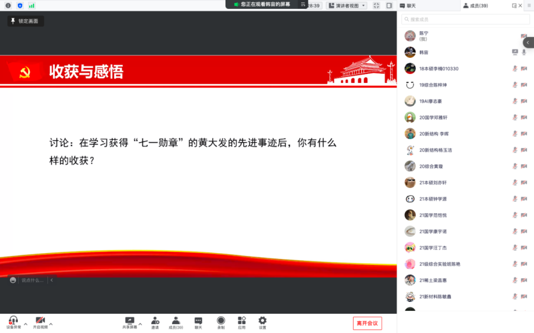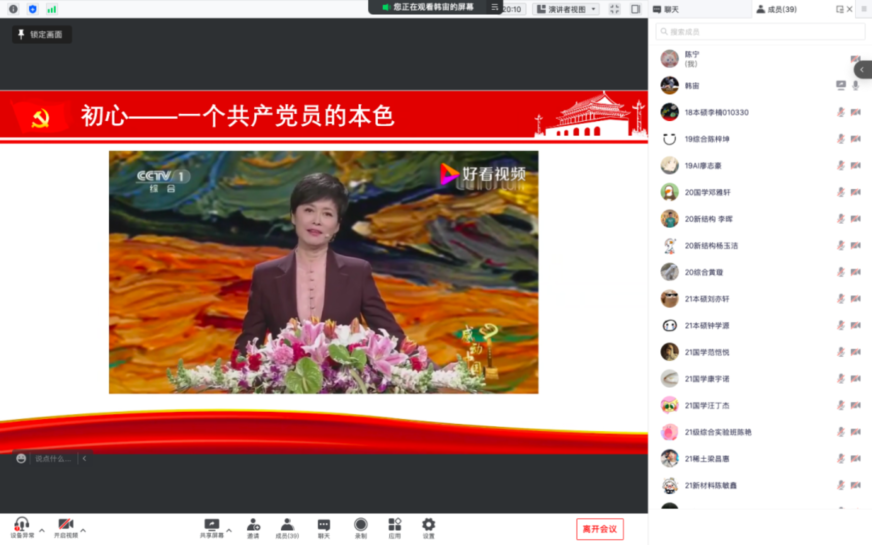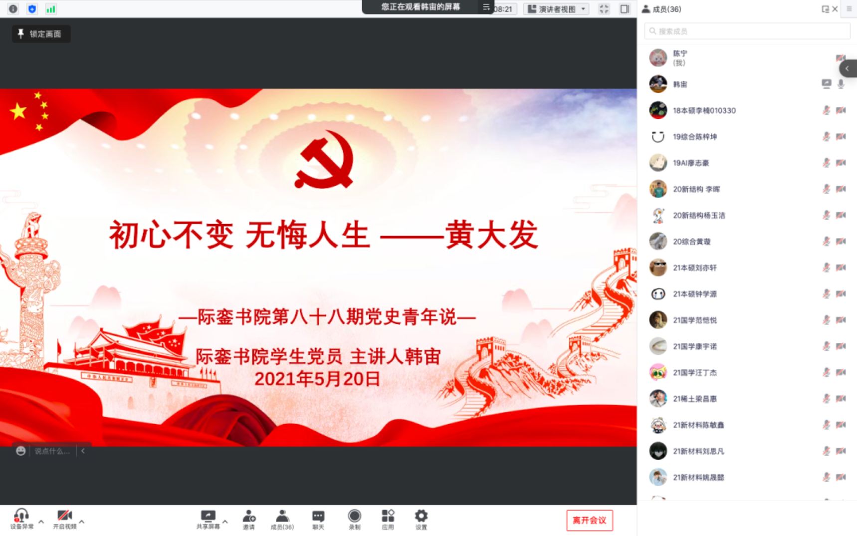 2022年5月20日晚21:30,际銮书院党史学习教育——党史青年说(第八十八期)在腾讯会议线上开展,本期党史青年说的主题是“初心不变 无悔人生——黄大发”,由际銮书院学生党员韩宙担任主讲,书院各年级学生共计30余人参加。