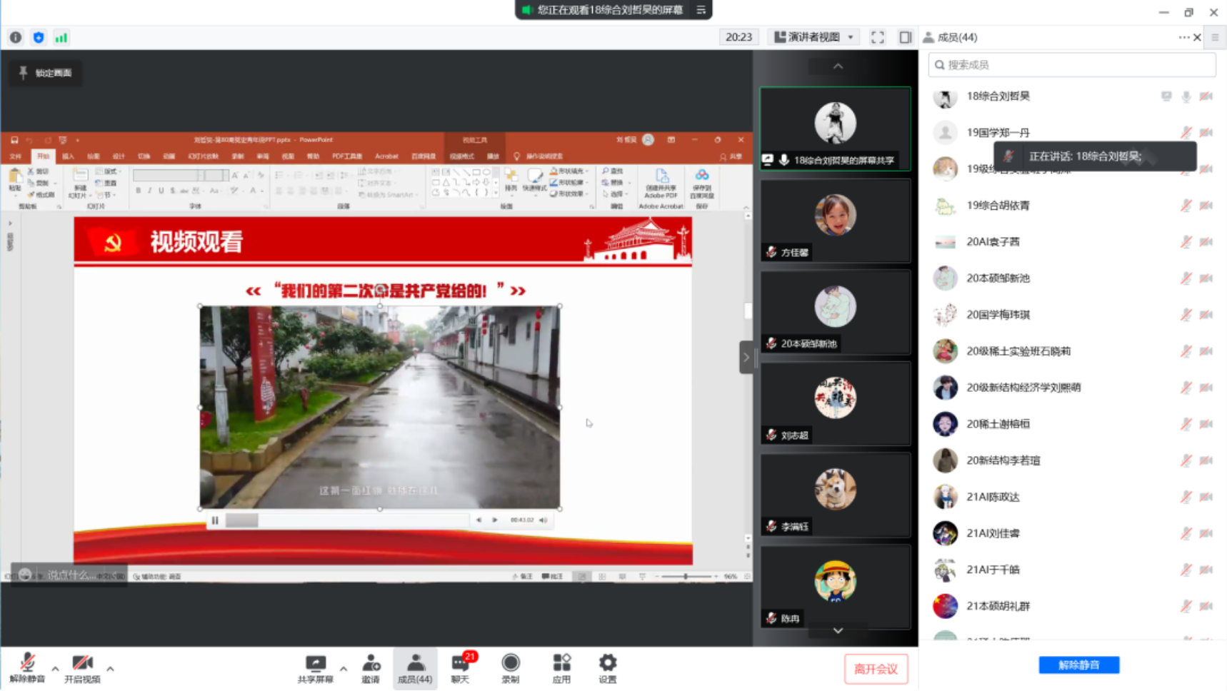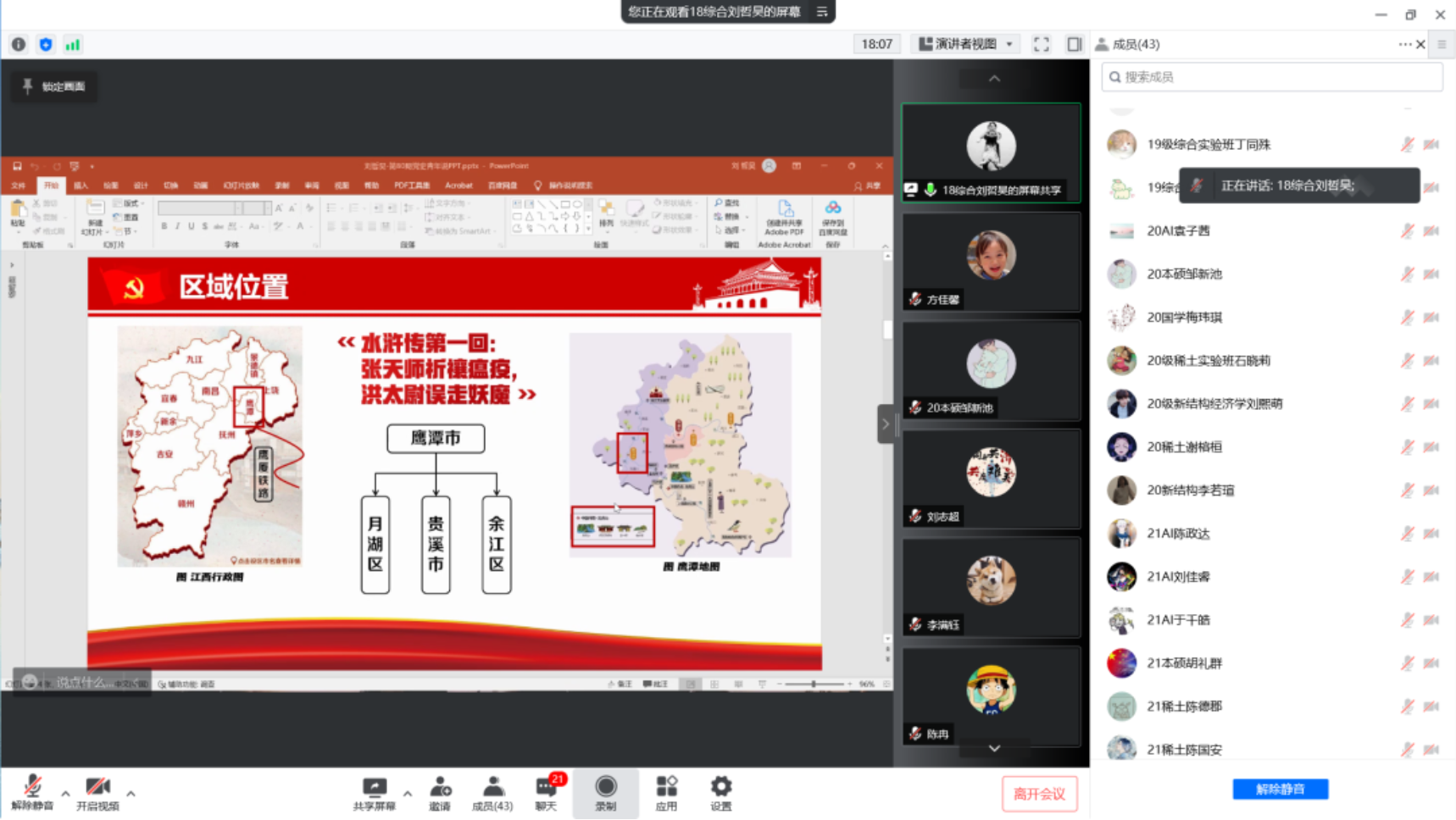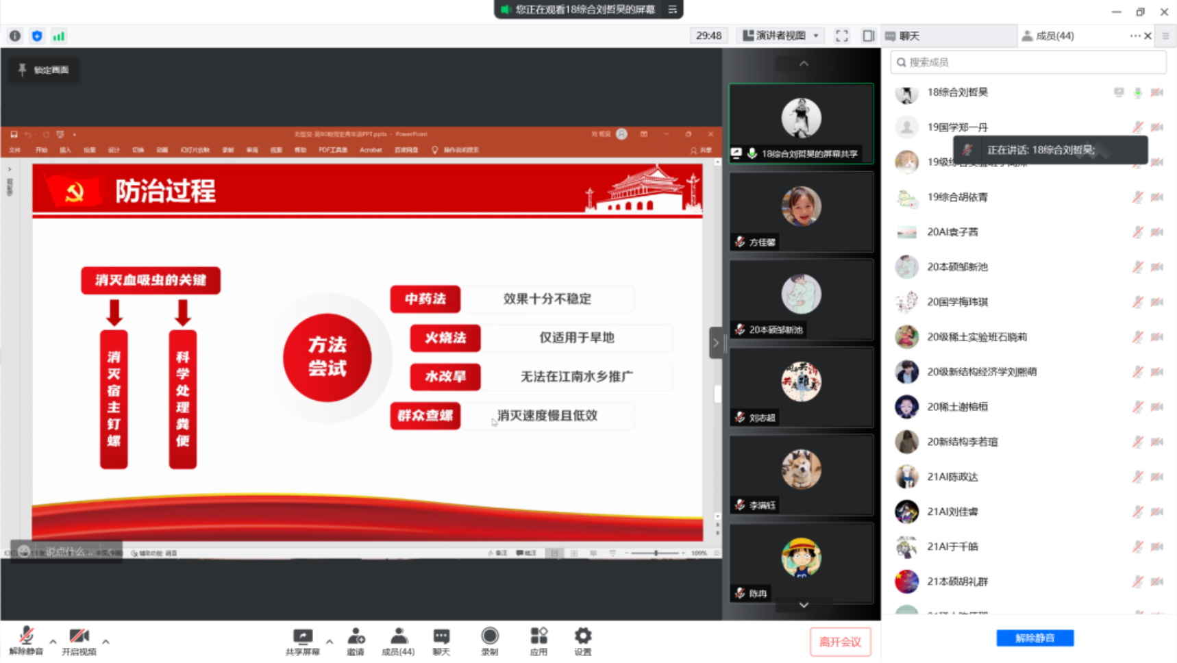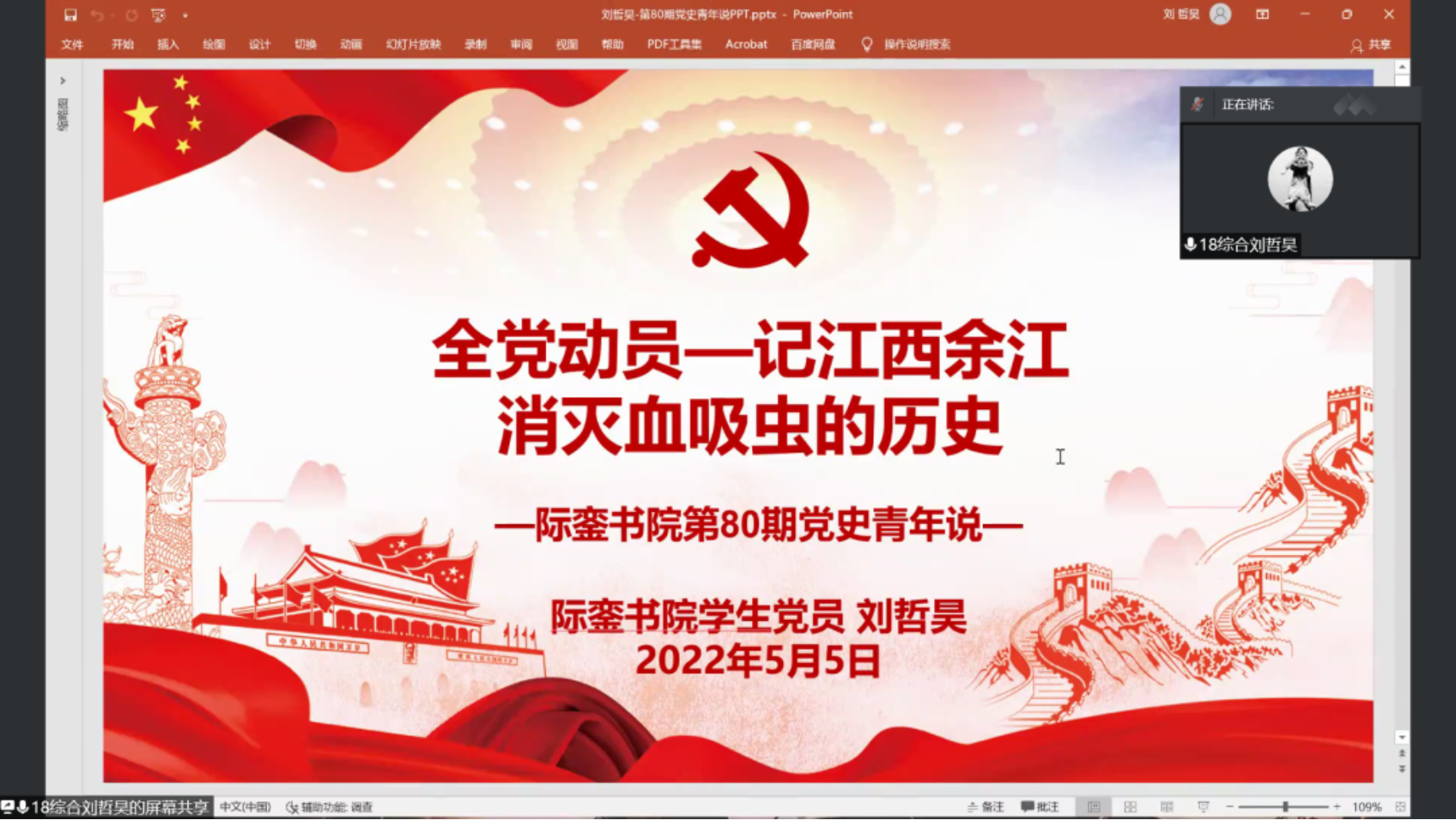 2022年5月6日晚21:30,际銮书院党史学习教育——党史青年说(第八十期)在线上腾讯会议开展,本期党史青年说的主题是:全党动员——记江西余江消灭血吸虫的历史。本期党史青年说由际銮书院学生党员刘哲昊担任主讲,书院各年级学生共计40余人参加。