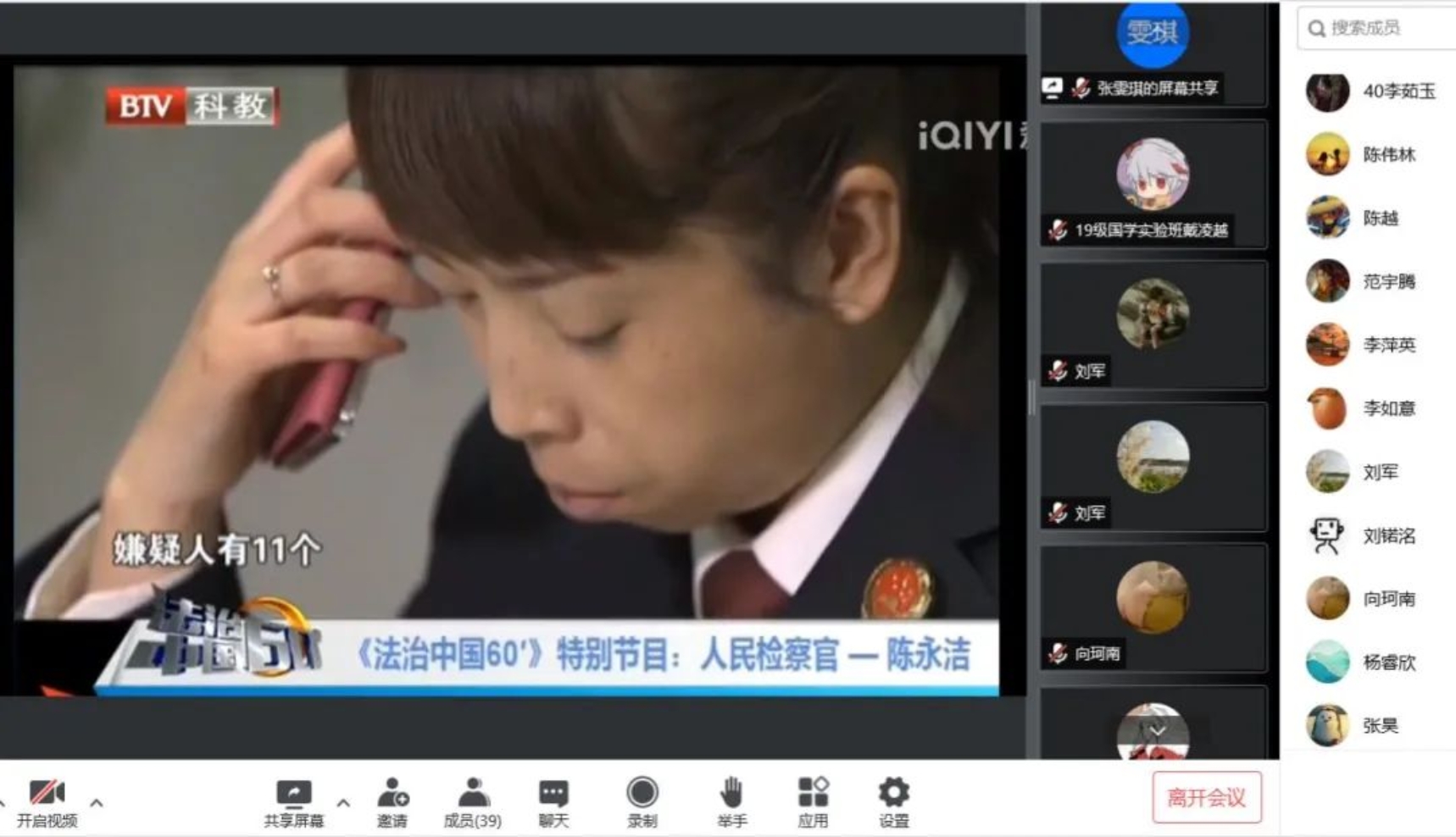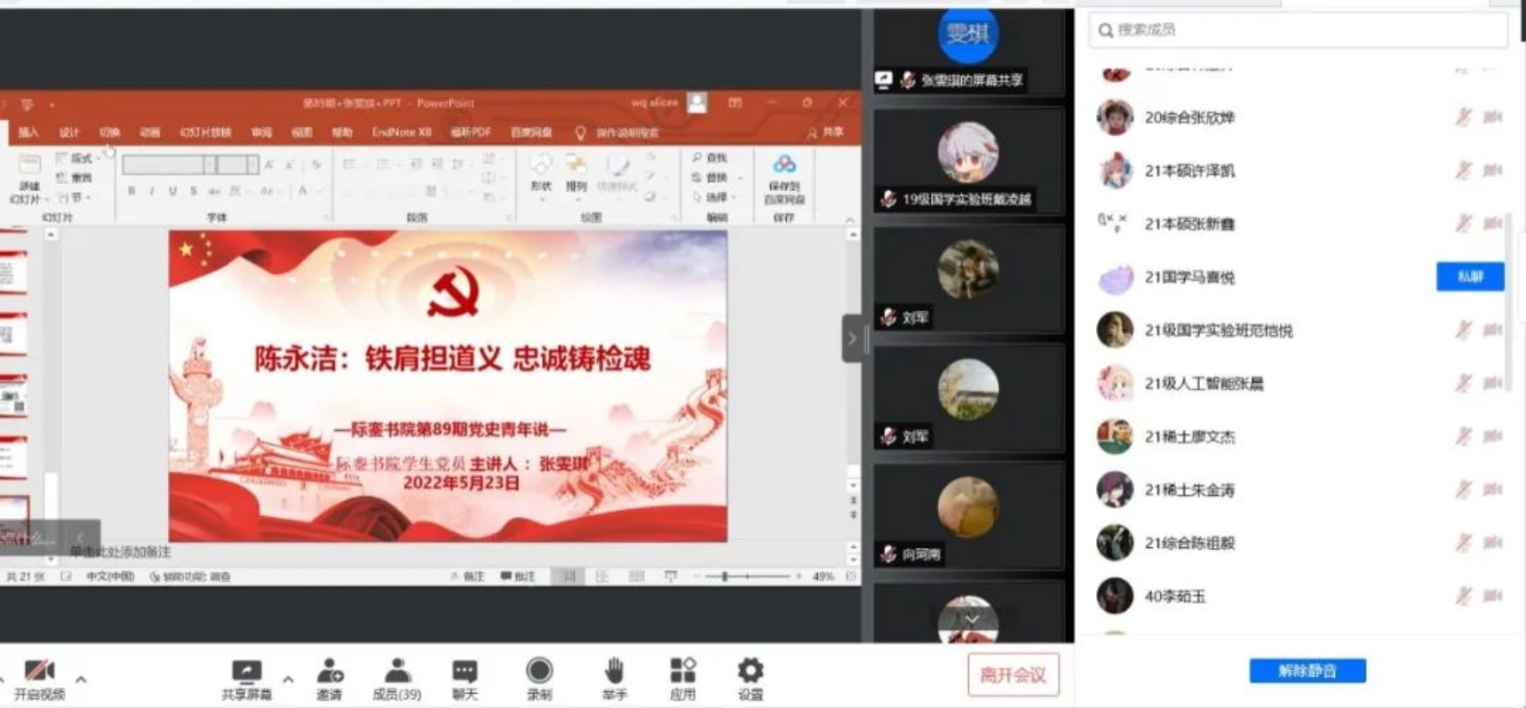 2022年5月23日晚21:30,际銮书院党史学习教育——党史青年说(第八十九期)在线上腾讯会议开展,本期党史青年说的主题是“陈永洁:铁肩担道义,忠诚铸检魂”,由际銮书院学生党员张雯琪担任主讲,书院各年级共计30余人参加。