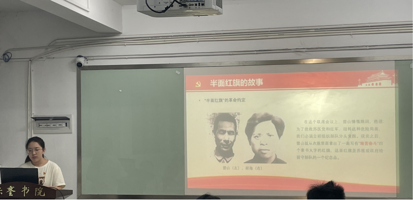 图 主讲人领学 半面红旗的故事是一段悲壮而感人的历史。在第五次反“围剿”后,中央红军主力被迫长征,时任中共江西省委书记的曾山率领部队留守苏区掩护主力转移。在与战友胡海分别时,他拿出一面写有“艰苦奋斗”的红旗(原是苏维埃政府给留守部队的纪念品)一分为二,各自保留一半作为勉励。不幸的是,曾山的半面红旗在突围时遗失;胡海因被叛徒出卖在突围中被捕牺牲,他的半面红旗由其妻弟钟荣榜保留了下来。