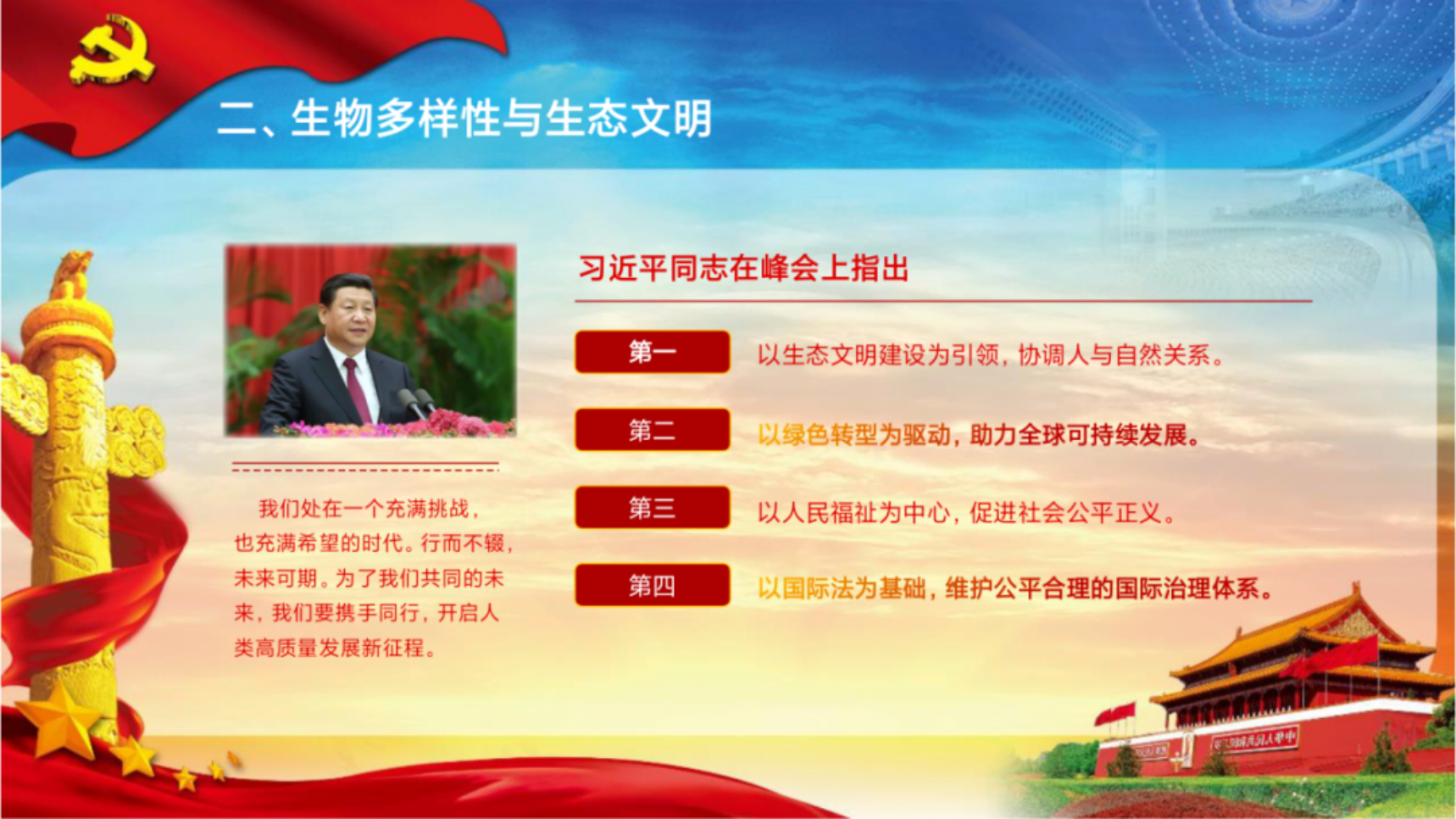 2021年10月12日下午,国家主席习近平以视频方式出席在昆明举行的《生物多样性公约》第十五次缔约方大会领导人峰会,并发表主旨讲话。 本期微党课由际銮书院学生党支部蓝志鹏同志主讲,让我们跟随他一同学习。