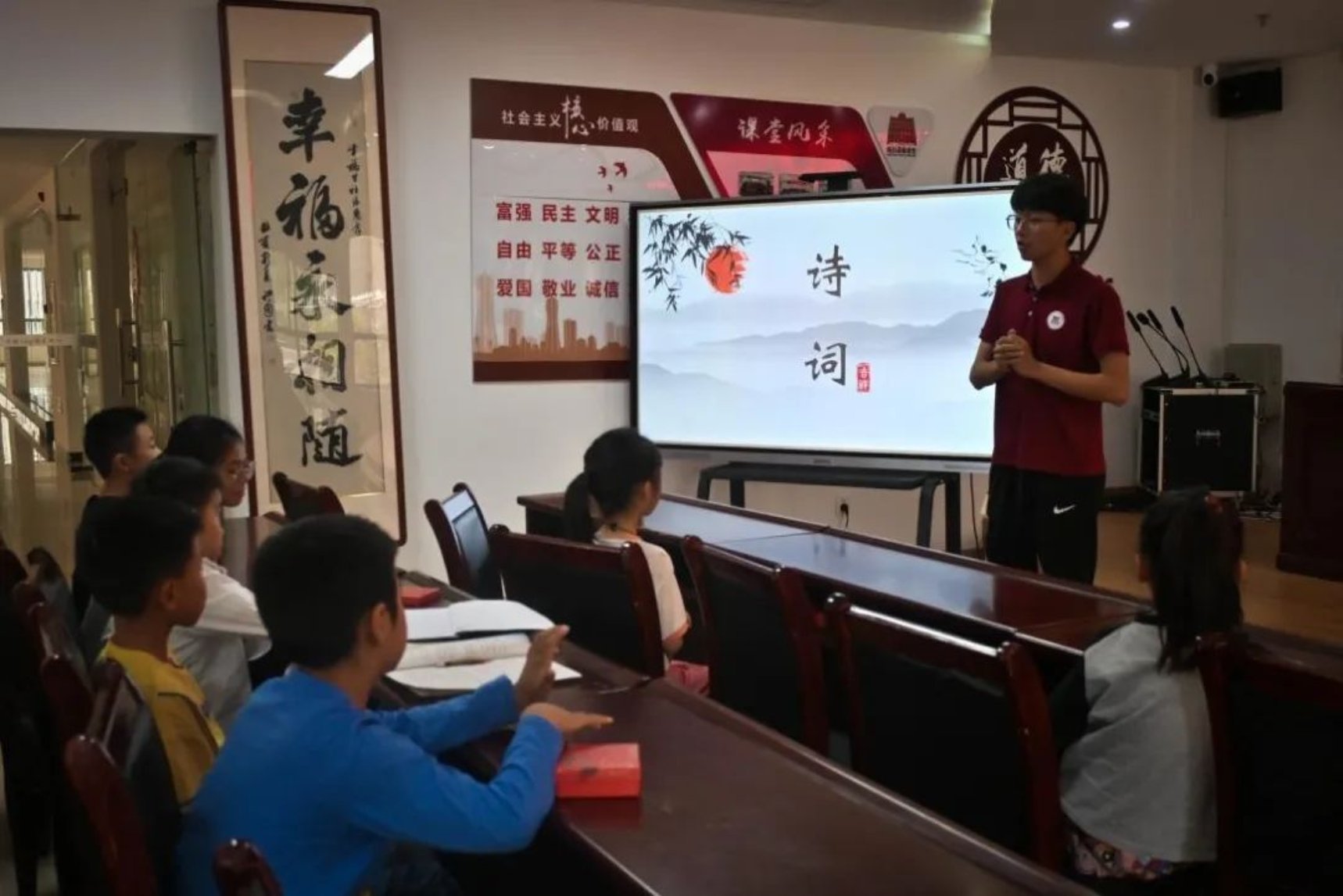 图/曾楷钧同学带小朋友们玩诗词卡片游戏 在第二节理论课上,主讲人以赣鄱诗人为主题,介绍了两位来自江西的著名诗人:王安石和杨万里,主讲人将两位诗人的生平、著名诗词以及创作风格娓娓道来,让小朋友们感受诗句中所蕴含的家国情怀。