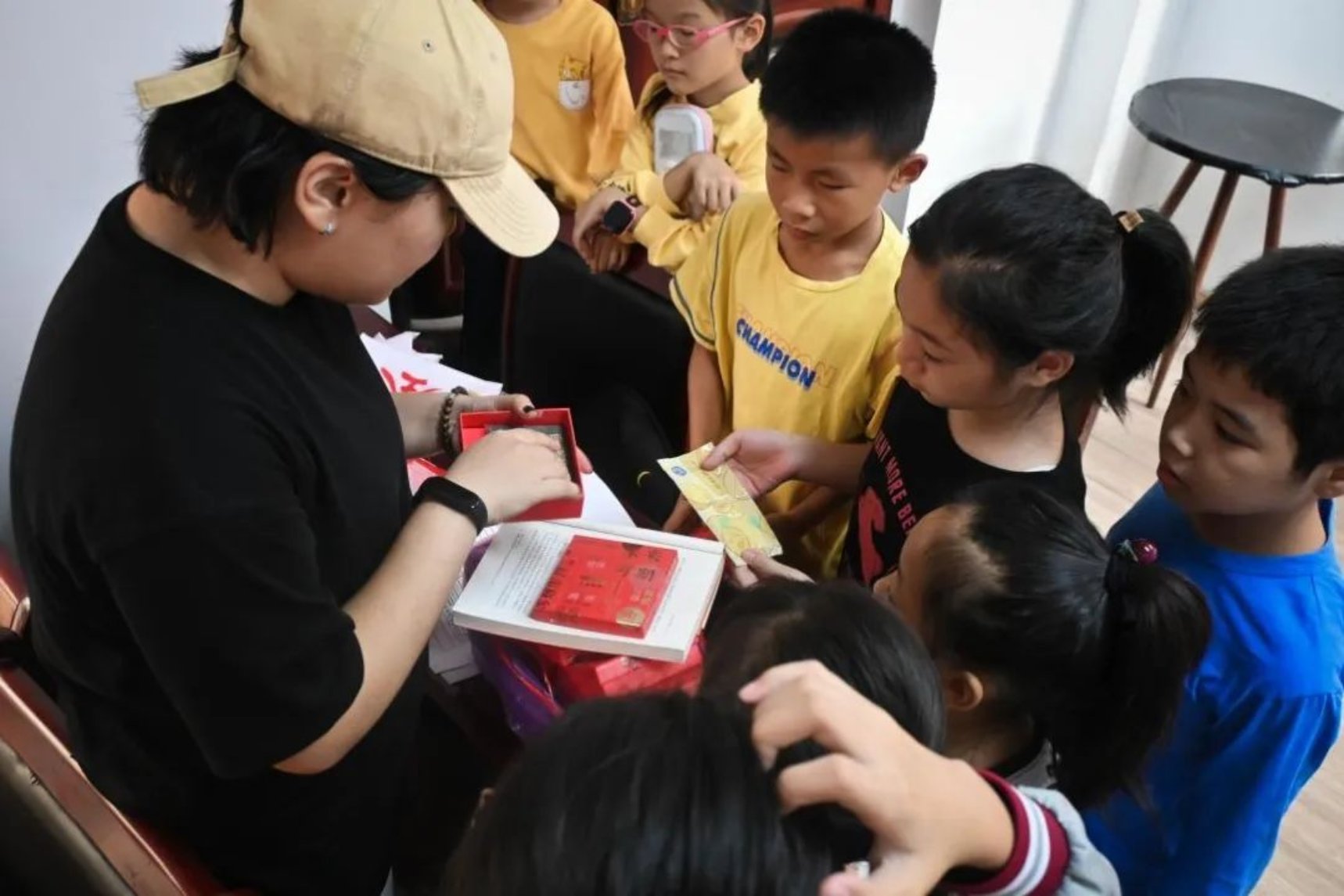 图/实践队骨干为积极回答问题的小朋友们分发礼物