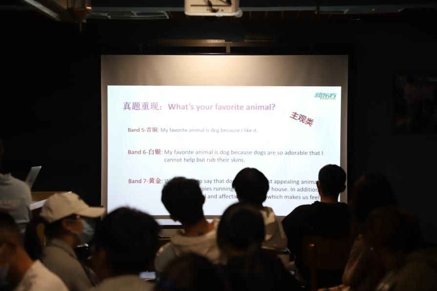 图/现场互动 孔老师以话题“what’s your favourite animal?”为例,指出不同英语水平阶段词汇量区别。通过对动物不同特征的描述,让同学们在发言的过程中对词汇在英语学习的重要性有了更深的感触。在真题讲解环节,孔老师例举不同题目类型的主客观问法,进而归纳总结出面试中应对问题的公式。