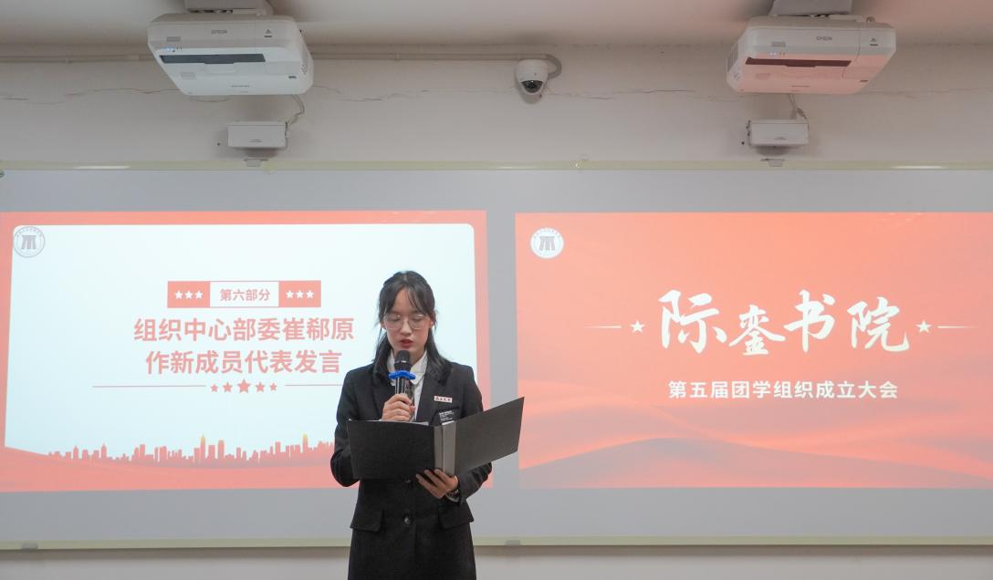 图/学生会主席胡罗明 第五届团学组织部委崔郗原作为新成员代表发言,她结合校训和参与书院团学组织培训活动所得,表达了对学校及书院前景无限的畅想,并联系“三牛”精神,期望全体团学组织新成员明确责任,不断学习,艰苦奋斗,成长为有担当、有能力的团学组织新一代。
