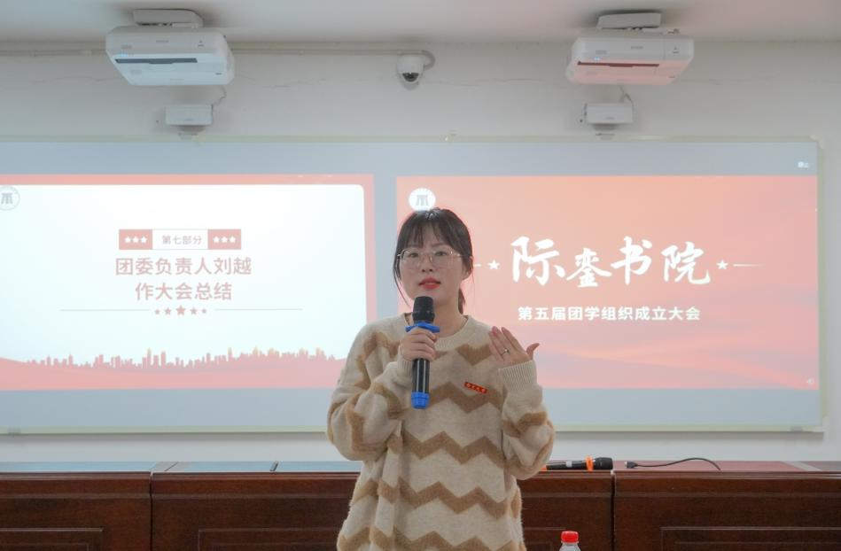 图/新成员代表崔郗原 铭记教导,砥砺前行 会末,由刘越老师作总结发言,她结合近期工作的实况和问题,提出要“拒绝定式,抛却模板,大胆开拓,勇于创新”,应当“反思初心,拒绝内耗”,在工作上“善于总结发现,做到贴心、暖心、细心”。此外,刘越老师对书院近期文体活动取得的成效表示了肯定,强调了书院集体的共同努力,鼓励大家“撕掉标签,全面发展”“学得精彩,玩得漂亮”,继续同书院学子加强“五育”并举发展,让书院这驾“大马车”走得更远、更快、更好。
