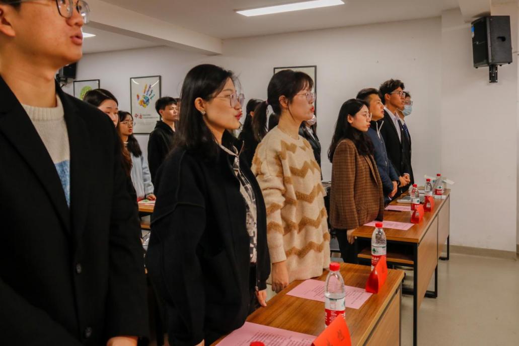 11月19日,际銮书院第五届团学组织成立大会在博学厅举行,书院学工办负责人周婵媛老师、团委负责人刘越老师、新媒体中心指导老师吴碧静、各年级辅导员老师、南昌大学各学生组织负责人以及各学院学生会代表出席,第五届团学组织全体成员参加。 伴随着热烈的掌声,大会正式开始,全体参会人员起立,齐唱国歌,现场庄严肃穆。 图/全体参会人员唱国歌 回首往昔,未来可期 刘越老师和吴碧静老师分别为第五届团学组织主席团和部长级成员颁发工作证,对新一届学生干部寄予了厚望。