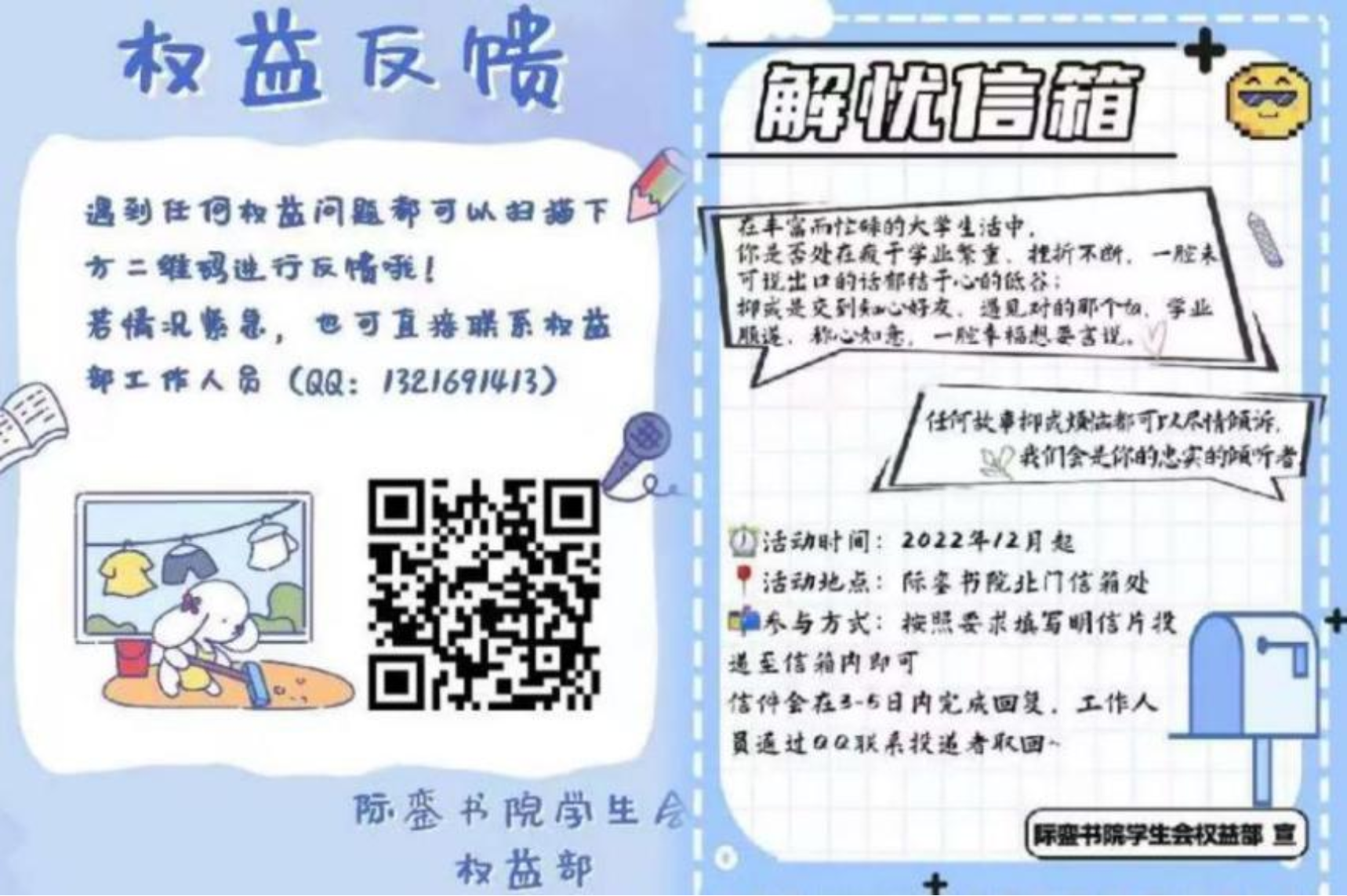 3.权益部 部门介绍:权益部秉持全心全意为同学服务的宗旨,负责收集和反馈学生权益问题、筹办心理健康活动,同时负责管理书院所有线下宣传平台。 部门标签: 忙碌与欢乐并存,工作丰富不平庸; 能力与技巧并进,为同学贴心守护。 工作掠影: