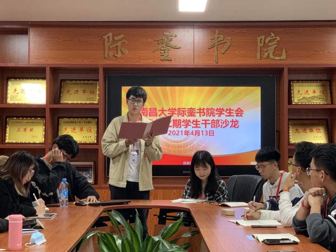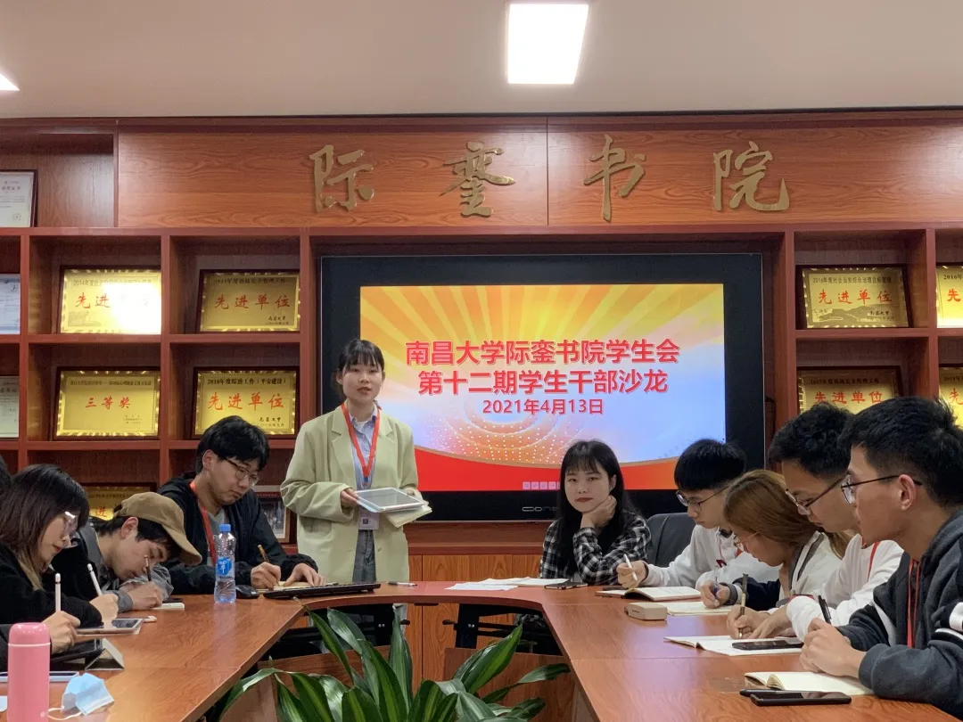 2021年4月12日21:20,际銮书院第十二期学生干部沙龙——学生会干部交流会于书院党委会议室举行,本期沙龙由际銮书院第三届学生会主席陈艺主持,学生会指导老师刘越及学生会主席团、部长级成员共计23人参加。